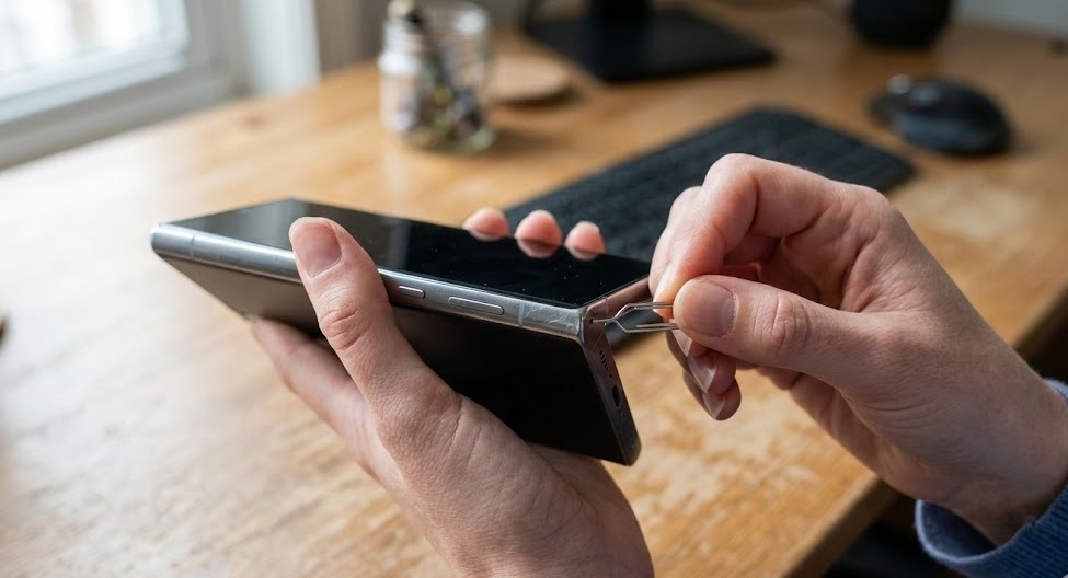 スマホを手に持ちながらピンを刺すと、力が分散して押し込みが甘くなることがあります。机の上に端末を置き、片手で軽く押さえてからピンを刺すと、真っすぐ力を加えやすくなります。